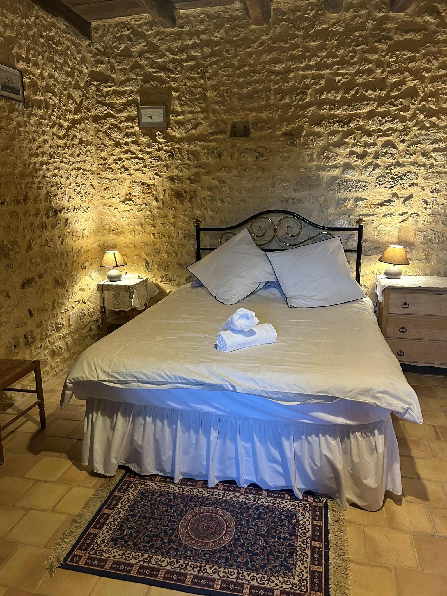 Our master bedroom offers a romantic retreat, featuring beautiful exposed stone walls and a charming brass bed. Wake up to breathtaking views of valley pastures, where you might even spot deer grazing peacefully in the garden. Every detail is designed for your comfort and delight.